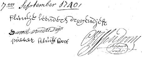 Aldus gedaen en geinventariseert in voegen hier vooren staet vermelt op de wooningh voornoemd en dat het op en aengeven van de voornoemde Pleuntje Leenderts Droogendijk dewelke ook verklaerde haer in het opgeeven van de voorenstaende staet en inventaris opregtelijk ende naar haere beste kennisse en weetenschap gedraegen te hebben sonder haerens weetens ietwat versweegen te hebben ofte verstooken ende agtergehouden veel min ietwat ter quaeder trouwe weeloos gemaekt te hebben concomeerende den voorenstaende geabandonneerde en insolventen boedel directelijk off indirectelijk beloonende mitsdien indien naer het sluijten deeser inventaris aen haer nogh ietwat te voorschijn ofte te binnen mogte komen het sij tot voordeel ofte tot lasten van denselven insolvente boedel te sulln aengeven ende deesen inventaris daer meede te doen amplieeren ofte te laeten corrigeren te vreed sijnde oversulken deesen ten allen tijden dat gerequireert werdende de deugdelijkheijt van dien met den ordinairen boedel eet te sullen bevestigen ten overstaen van de Heer Cornelis van IJsendoorn schout, Barent van der Duijn en Pieter Maertensz Kluijffhooft scheepenen van den Nieuwenhoorn voorn.