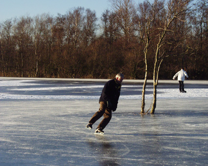 Als het lang genoeg vriest, organiseert de ijsclub Tenellaplas een gezellige schaatsbaan op de 's winters nog steeds natte bodem van het oude Vliegveld. (foto Wout v.d. Blink)